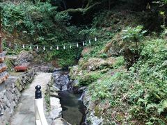 休憩箇所は、上り始めて間もなく、民家前に自動販売機あり。かなり上方に湧水あり。参道は木立に囲まれ見透せず、絶えざる緑と水の音。道を横切るカナヘビすら、その尾が青く輝く美しさ。
