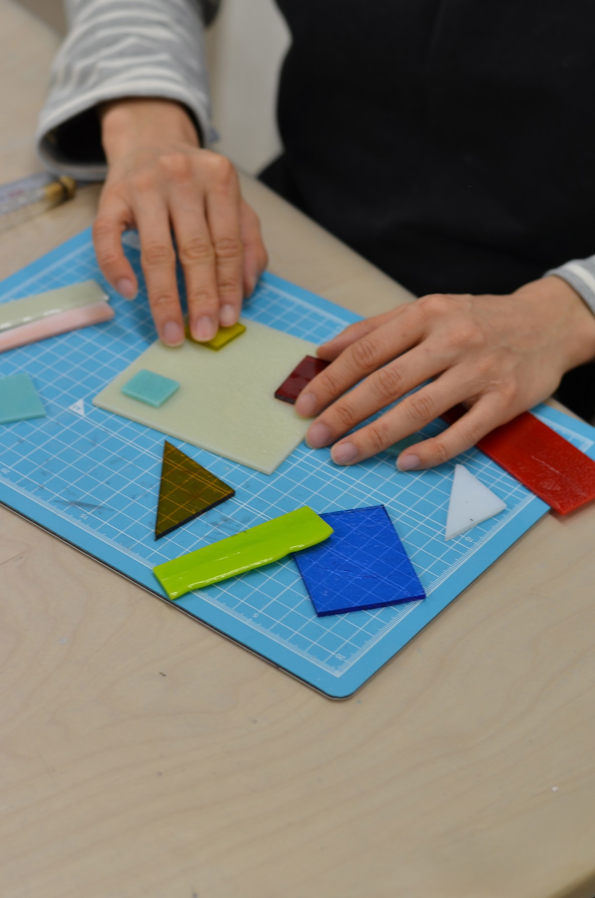 ◇好きな色の板ガラスをカットして並べ、ガラスの時計をつくろう♪