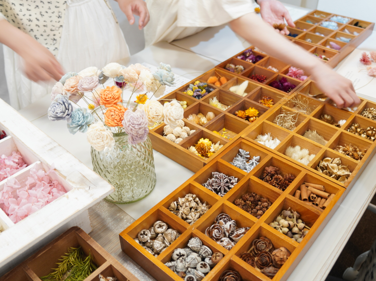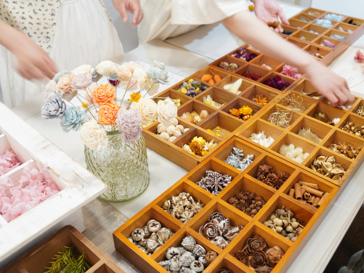 レッスン時間は約1時間ですが、花材選びに時間をかける場合は1時間半になることもございます。余裕を持ってお越しください。
