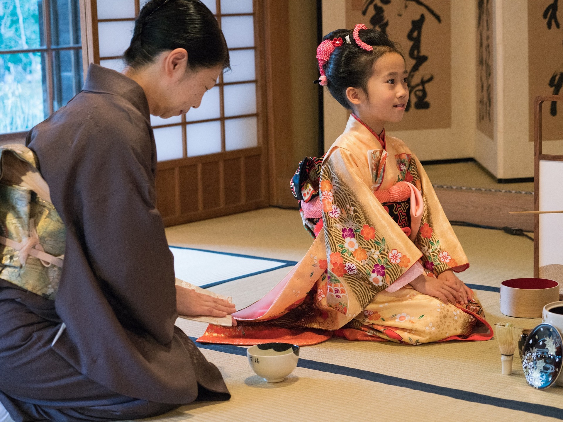 着物を着て、趣のある茶室で茶道体験。お抹茶や季節の上生菓子をいただきながら、茶道のいろはを学びます。