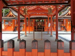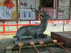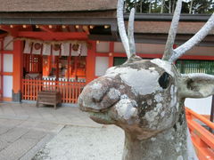 本殿裏には台風の影響で木を伐採したようで、神社=杜(もり)なので、ちょいと寂しい気がする。それはさておき、狛鹿は左は角がなく、右は角があるのが面白い。そして、目は玉眼風味である。