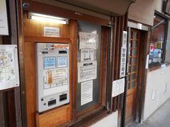 専用駐車場に車を停め、温泉街のゆるい下り坂を徒歩1分半ほどで到着。 入り口の券売機で大人入浴券200円を購入し 番台 へ提出。貴重品ロッカーは50円。