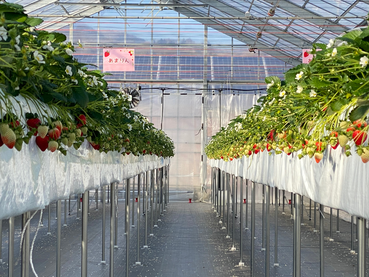 埼玉県秩父市下吉田・吉田フルーツ街道沿いにあるいちご農園「いちごハウスAYA」では、高設栽培なので、かがむのが苦手な方や、妊娠中の方でも立ったまま”楽々”いちご狩りができます。