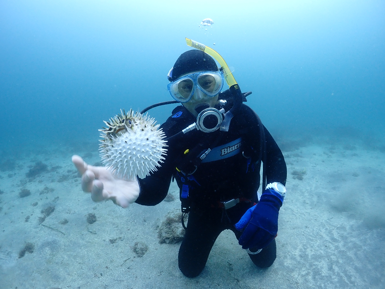 冬は濡れないドライスーツで1年で最も透明度が良い海に潜れます。