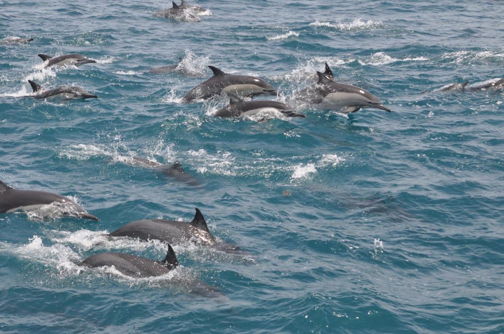 船長さんは漁師さんだそうでとても熱心にイルカやクジラを探してくれました。すると、まずはイルカの大群と出逢え前にも横にも間近でイルカが飛び跳ねるのを見られました。イルカの親子もいました。大海原で優雅に泳ぐイルカの大群は圧巻です。子供もすごく感動してくれました。