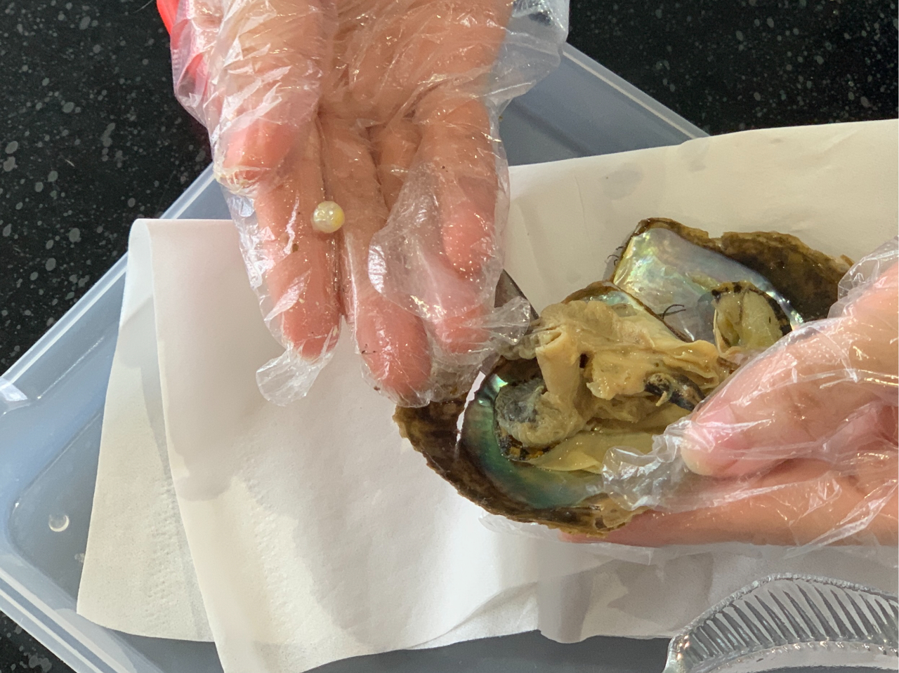 自分の手であこや貝から真珠を取出す貴重な体験ができます。