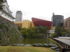 小倉城越し見る小倉のリバーウォーク北九州、対照的な新旧の建物が違和感なく調和している景色は素晴らしい。勝山公園含め道路一本、川一筋で繁華街と文化施設を明確に美しく区分けしている都市も珍しい。