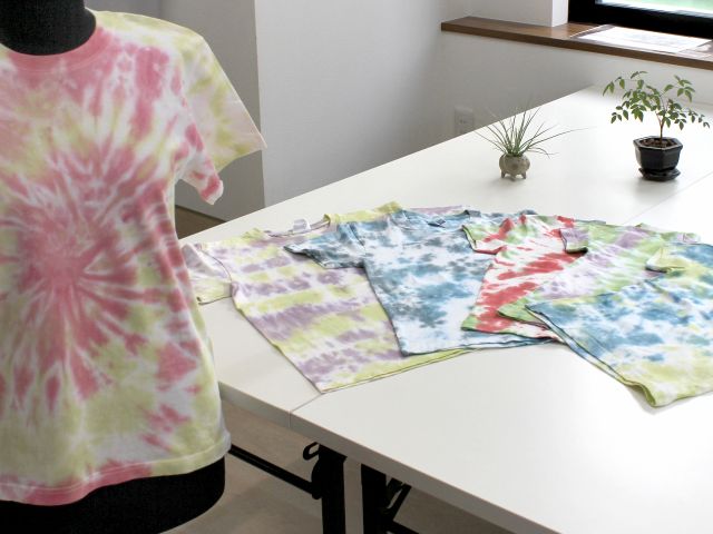 好きな色を選んで絞ったTシャツに色を入れます。お好きな色を2色選べます!