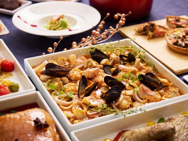 彩り豊な前菜やサラダ、魚料理、お肉料理など多彩な食材がビュッフェボードに並ぶオールデイダイニング&ラウンジ「ザ・ループ」のビュッフェ。シェフが目の前で調理するライブ感あふれるグリルコーナー などの出来立てをお楽しみいただけます。