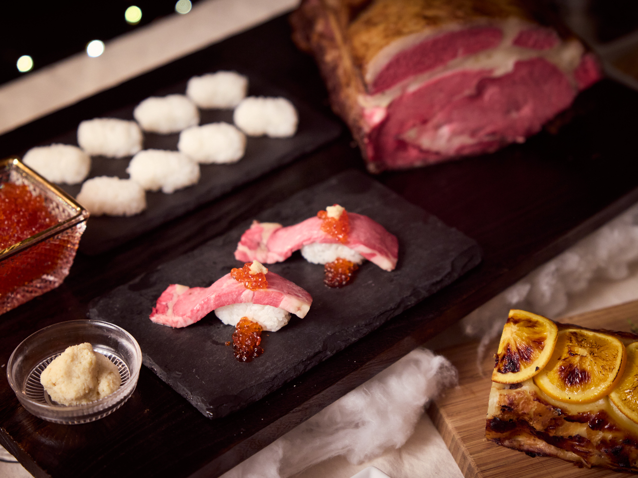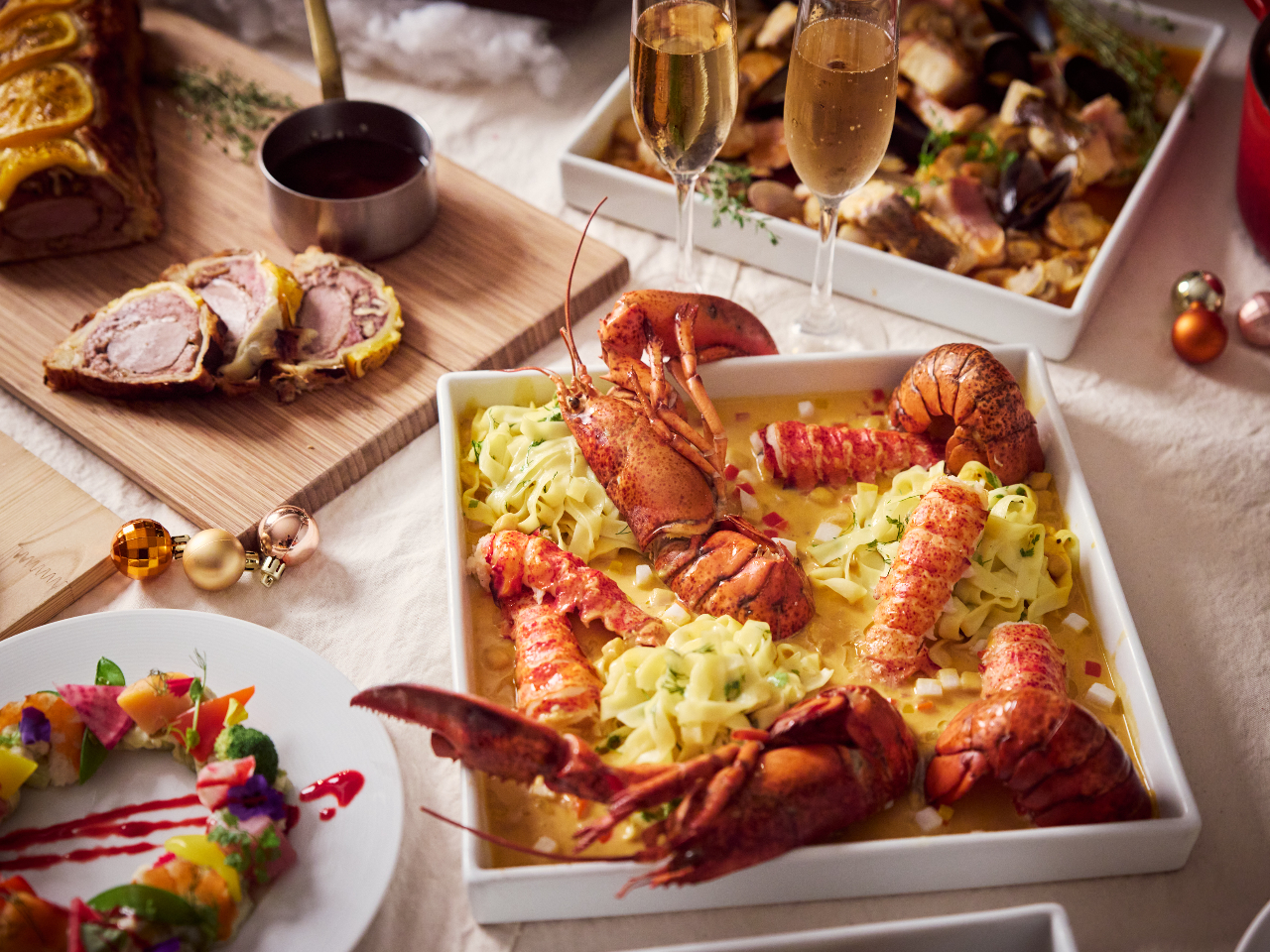 仔羊のローストやトリュフ入りズワイ蟹のパスタ、ライブコーナーでは国産牛ローストビーフのお寿司や天婦羅、鴨のパイ包み焼きをお楽しみいただけます。