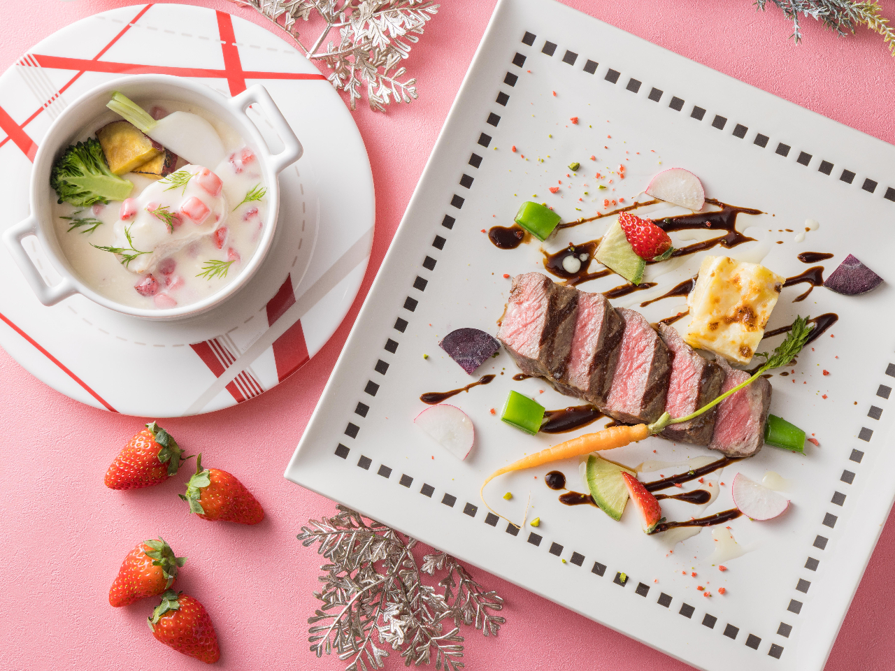 この季節ならではの瑞々しいいちごを前菜からデザートまで取り入れ、新春を彩る軽やかな香りと華やかさ、そしていちごが持つ甘味と酸味が織りなす新たな味わいをご堪能いただけます。