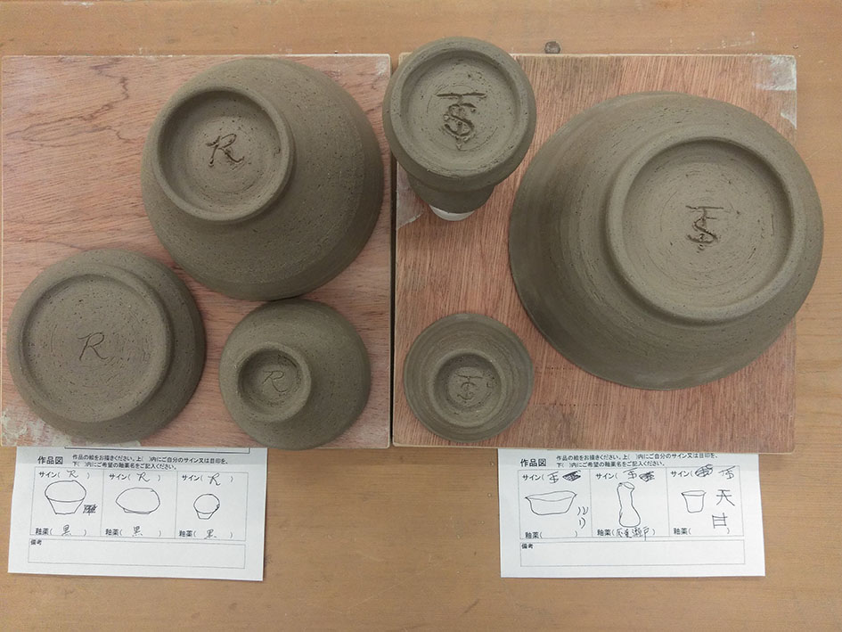 体験作品を削った後、並べて見たところです。サインも入って、世界に1つだけの作品に!これを焼き上げてあなただけの作品ができあがります。出来上がりをお楽しみに。
