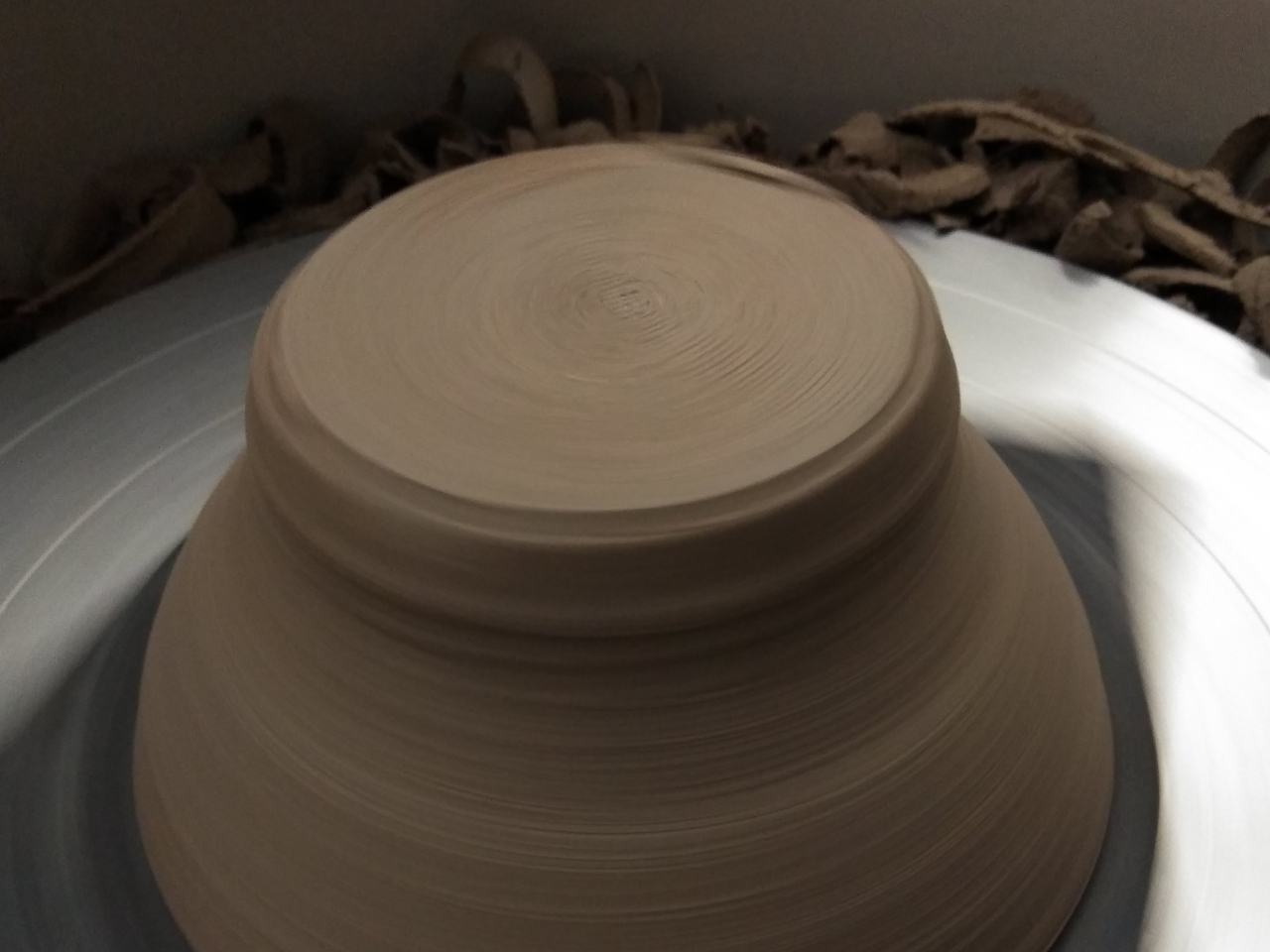電動ろくろの体験は成形で終わりますが、実はここからの作業がとても大切です。画像は作品を半乾燥して裏返しにしたもの。これから、高台(器の底)を削りだします。