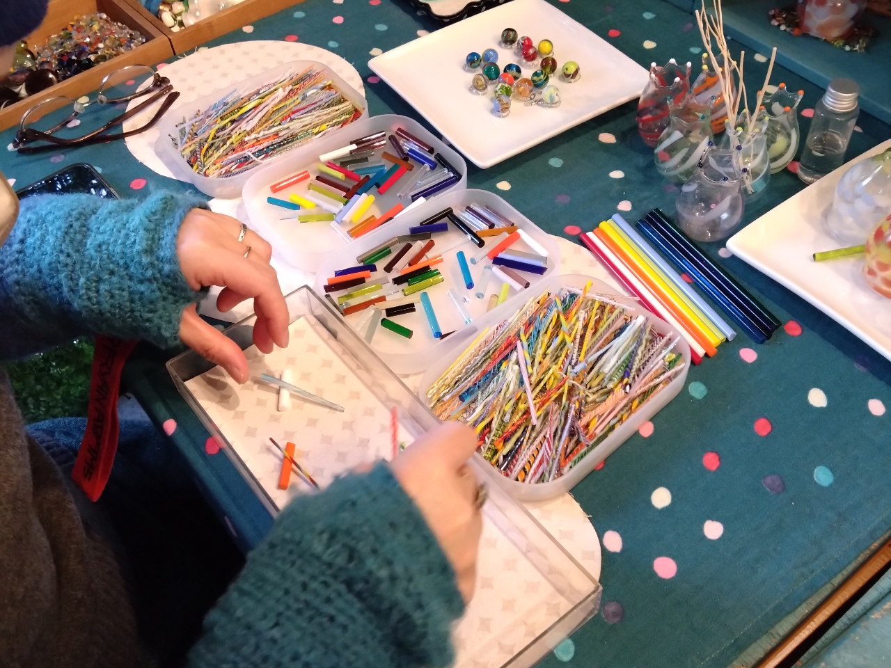 ベース玉の色と模様となるレース棒を3セット選びます!