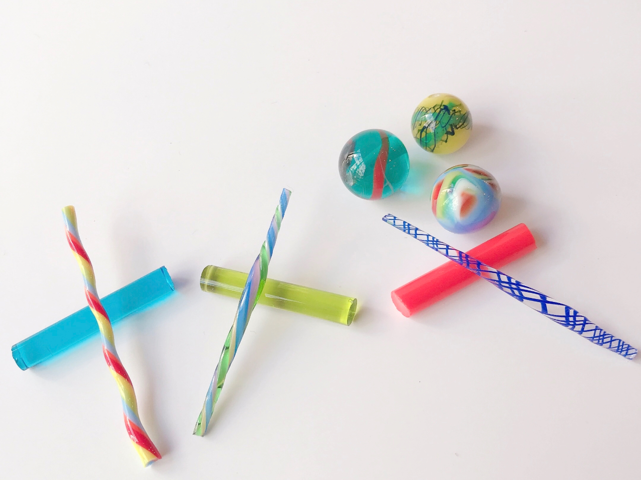 玉の色(ベース色)を3色と、模様となるレース棒をそれぞれ選び、バーナーでガラスを溶かし鉄芯に巻き取ってじっくり作ります。冷めたら鉄芯から外して出来上がり!