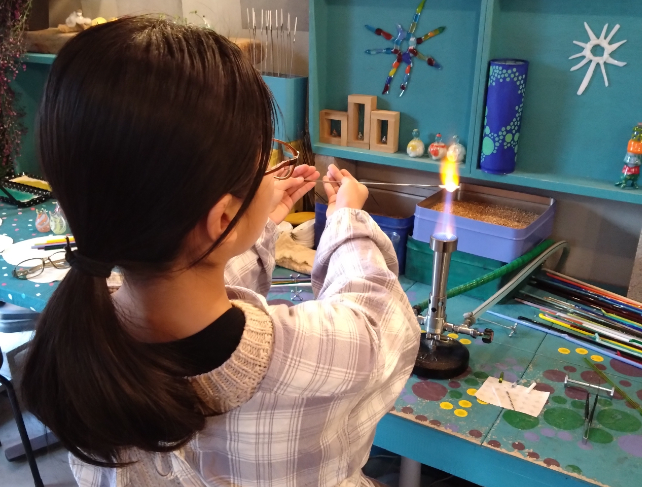 とんぼ玉は好きな色と模様を選んで、バーナーでじっくり溶かし作ることができます!