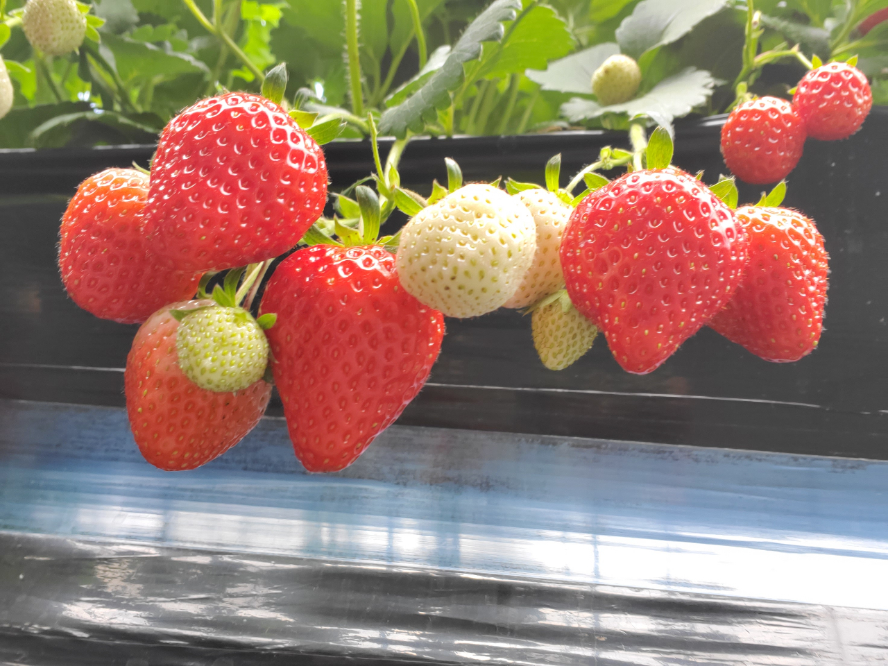 ■いちごは空中栽培「さぬき姫」「かおり野」「よつぼし」など、その時一番食べごろのいちごが40分間食べ放題!!練乳の持ち込みもOKです!!