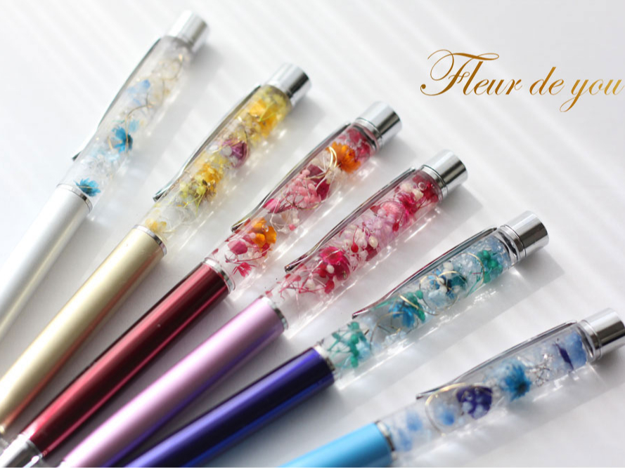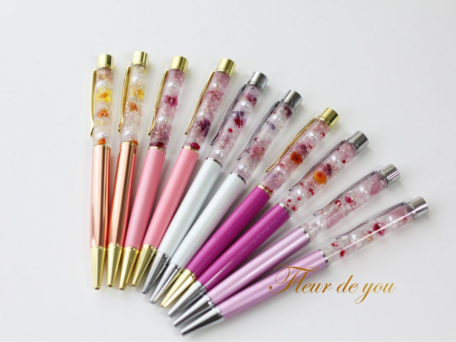 人気のハーバリウムボールペンの体験講座です。実用的でかわいいアイテムで勉強も仕事もはかどるかも