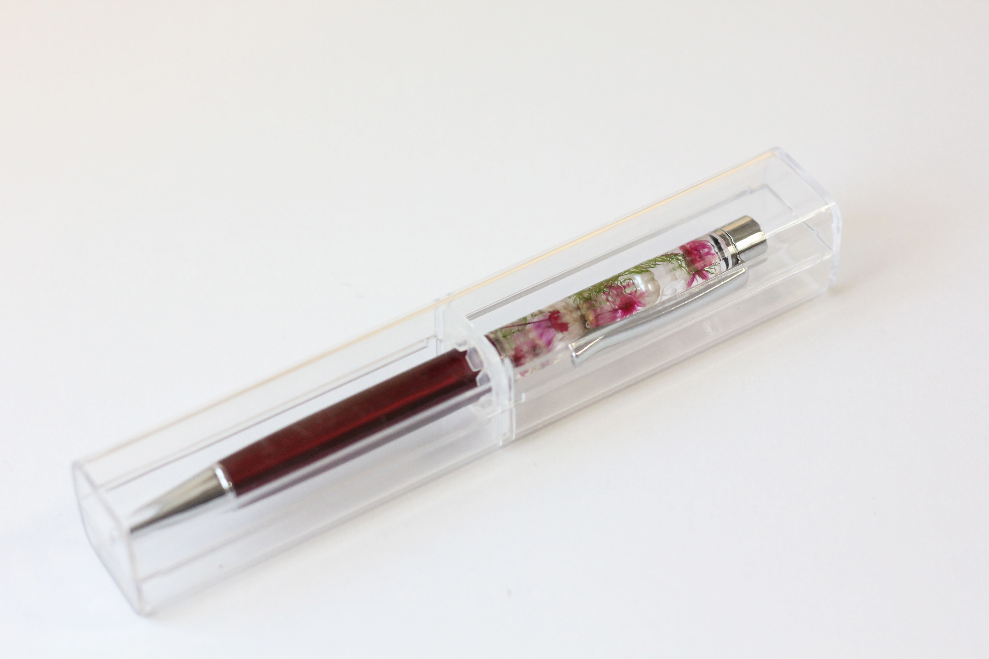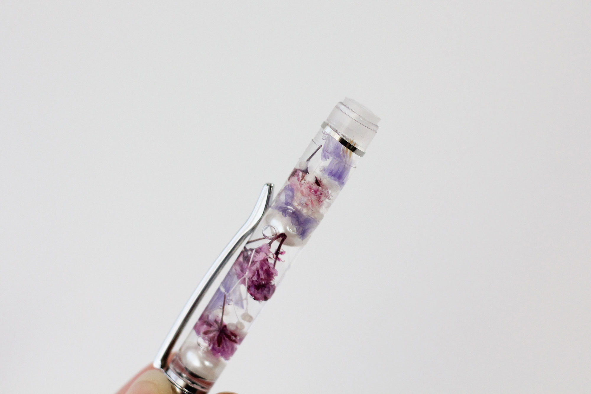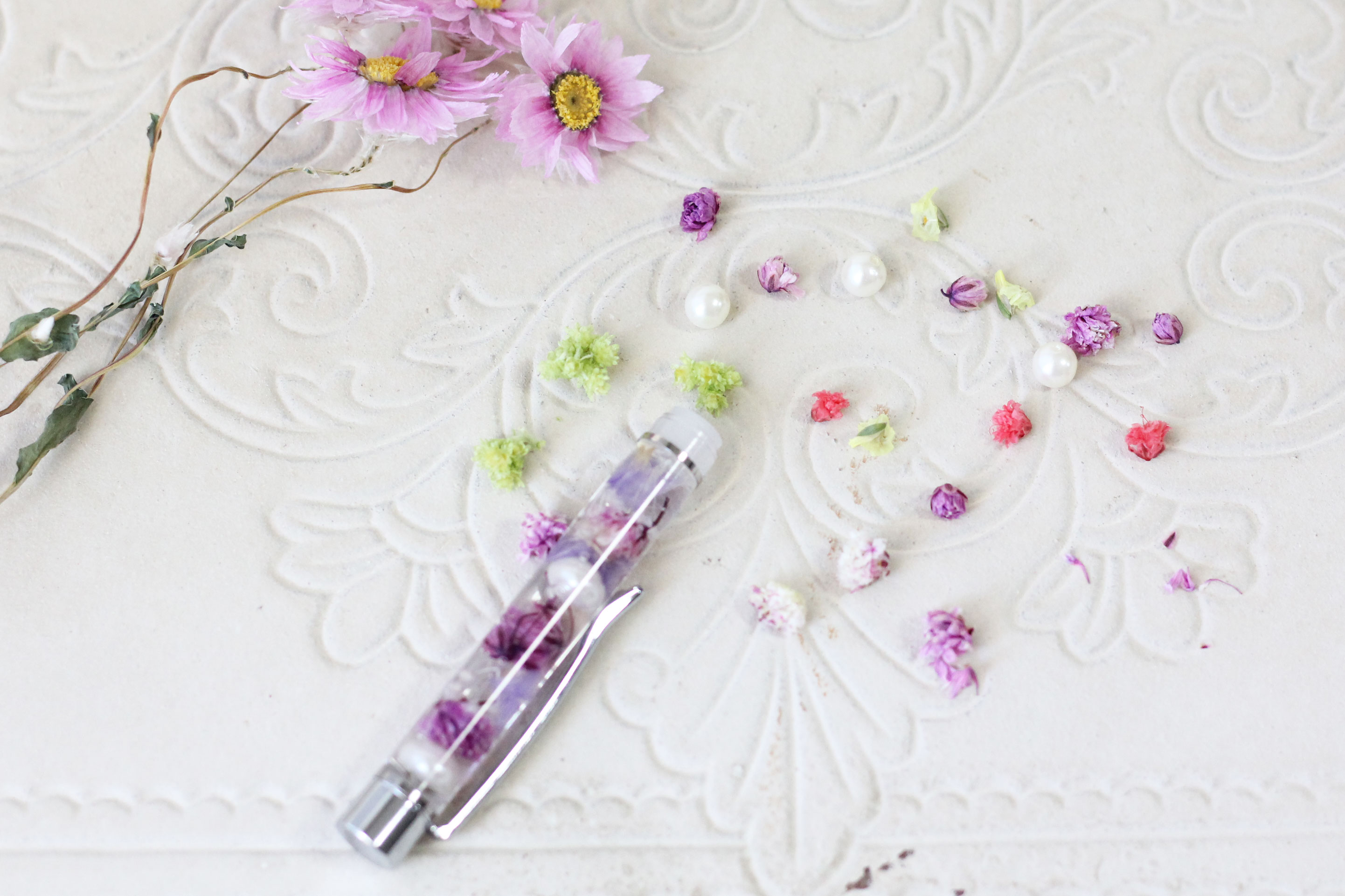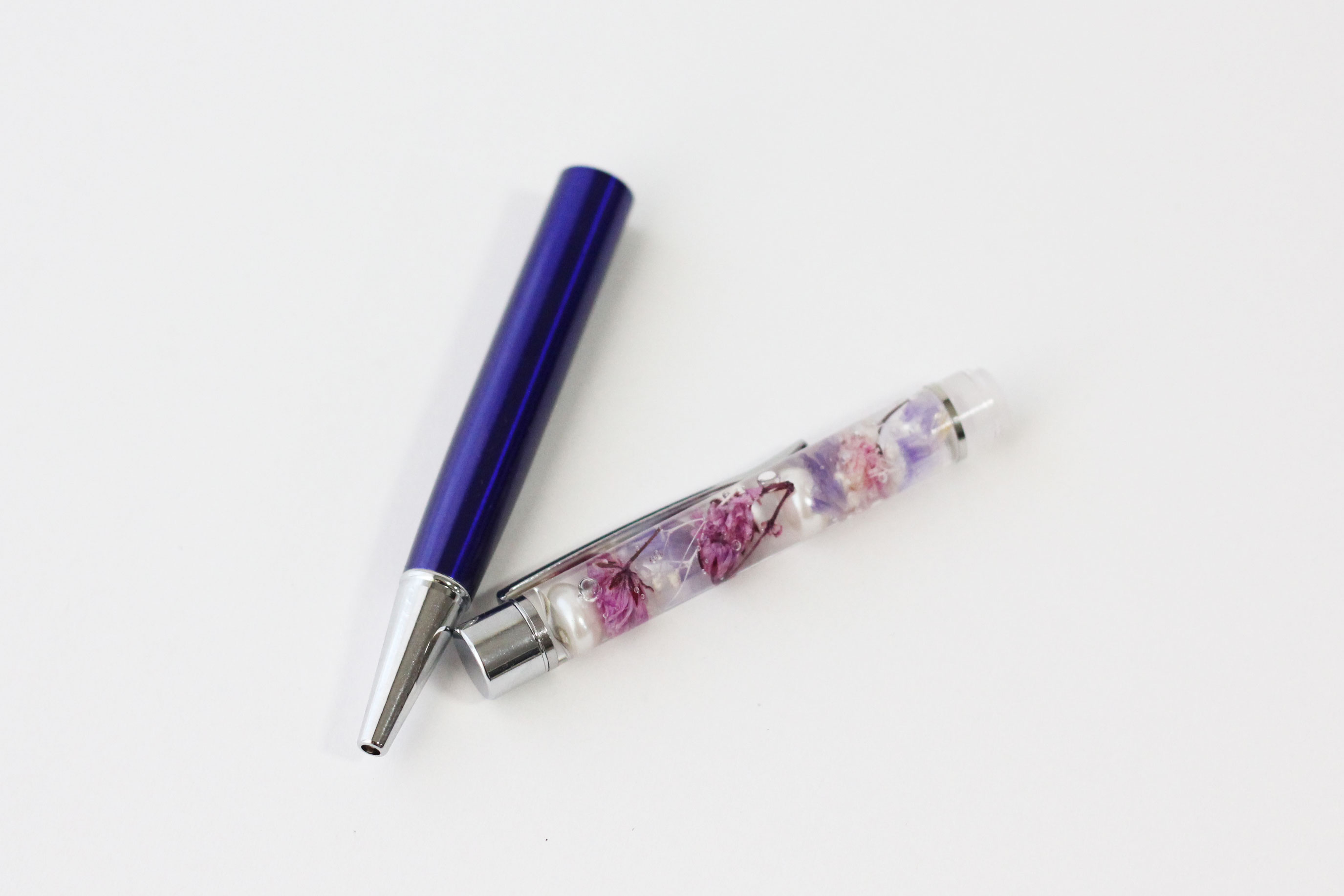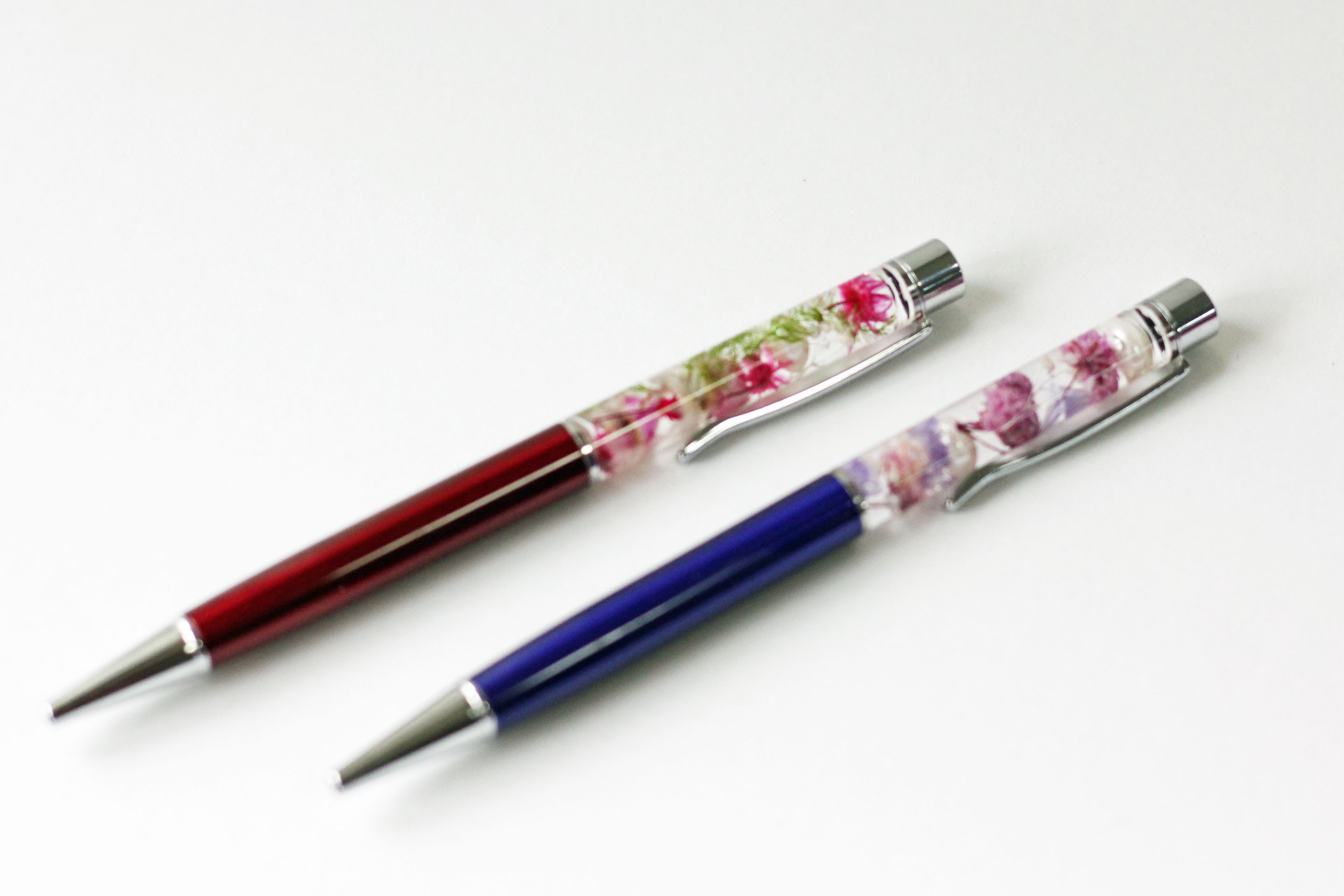 人気のハーバリウムボールペンの体験講座です。実用的でかわいいアイテムで勉強も仕事もはかどるかも