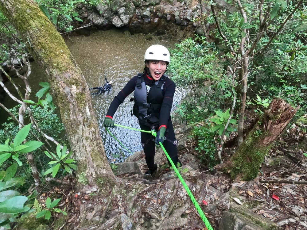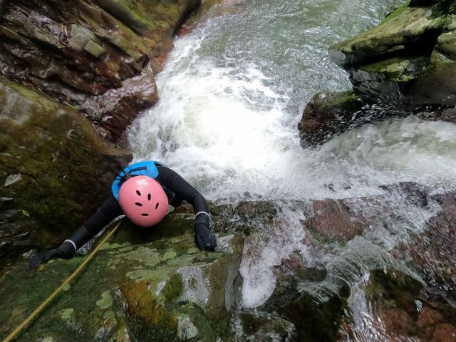本格的にヘルメット、ハーネス、カラビナを装着、険しい滝や崖をロープを使いクリアコース