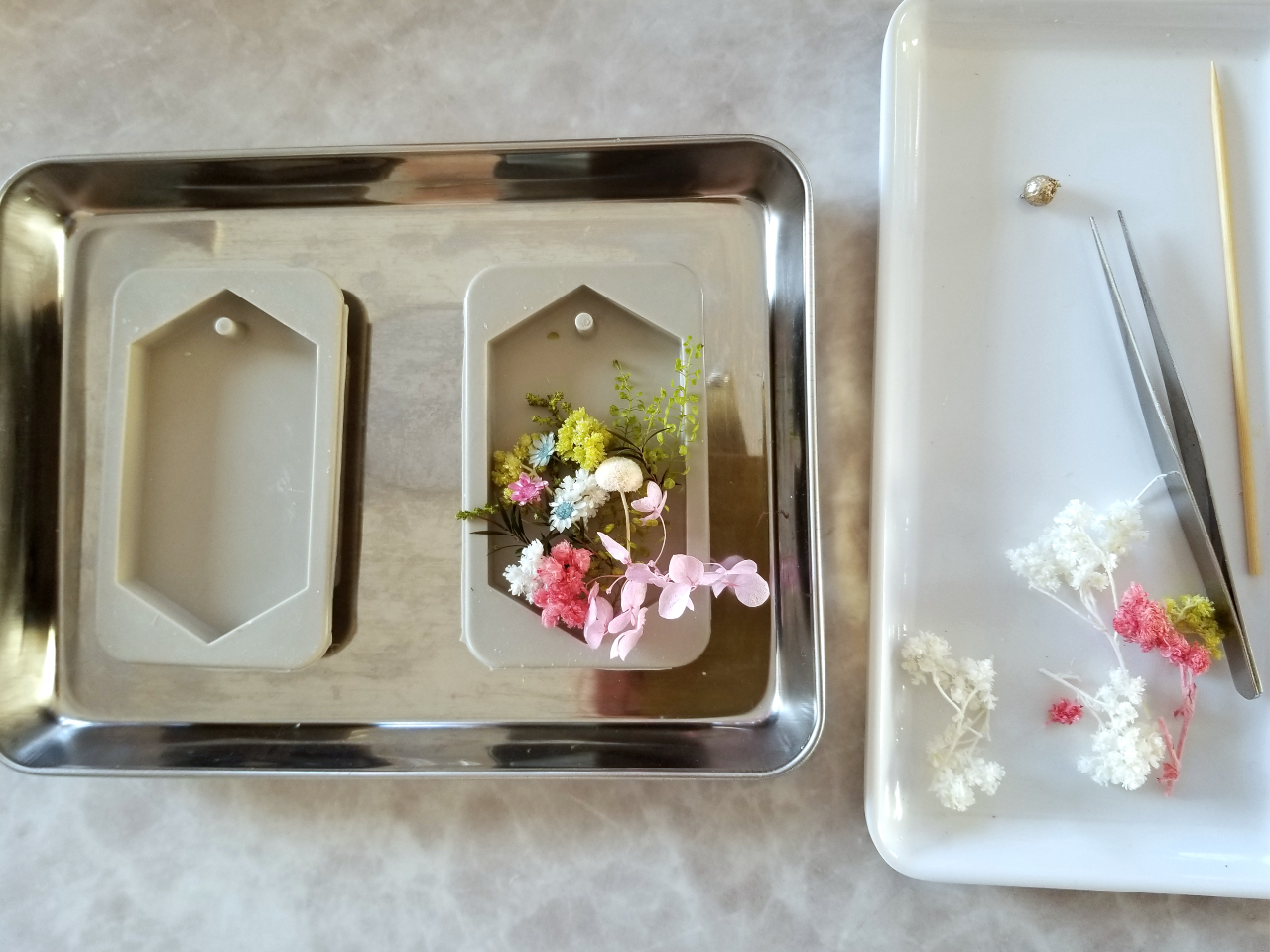 ビンの中に納まるサイズにお花をカットし、ピンセットを使い入れていきます。