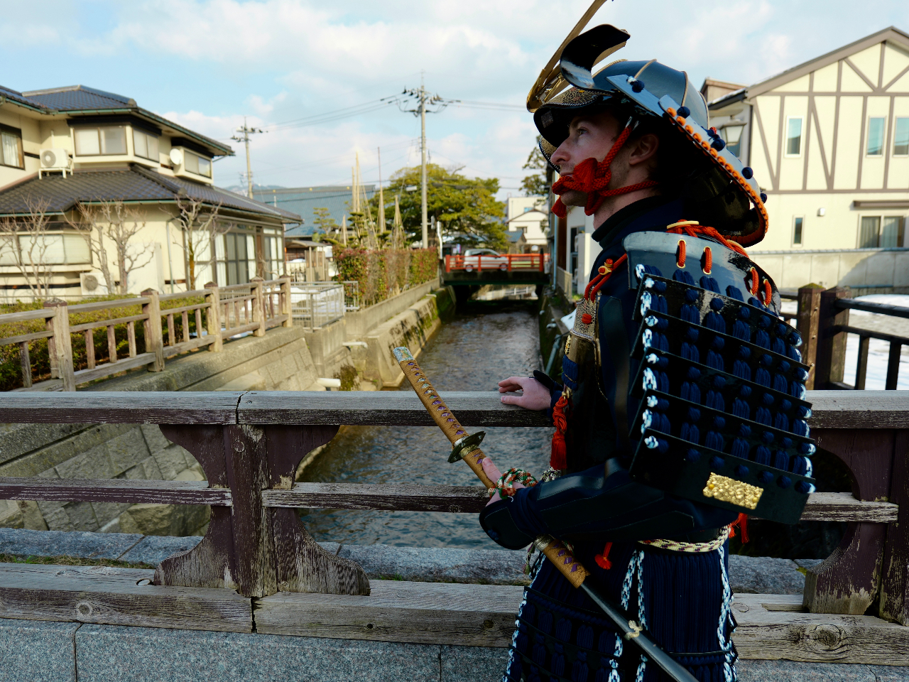 戦国武士の甲冑を着て丸岡城の城下町を散策できます。丸岡城を背景に写真を撮って、SNSで自慢しよう!夜は貸切の丸岡城天守から城下町の夜景を楽しんだり、「一筆啓上」お手紙体験ができたりします。