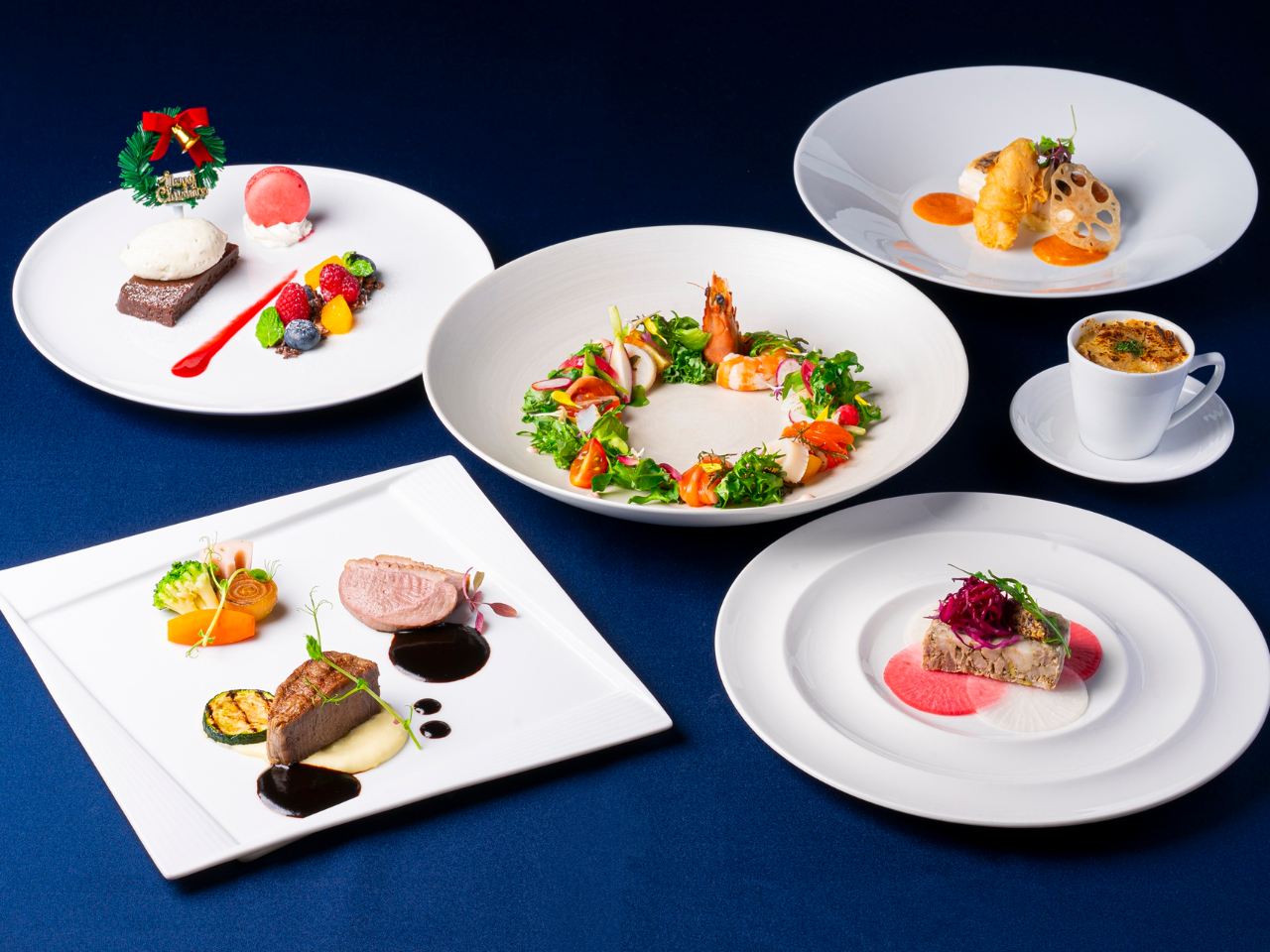 牛フィレと鴨をどちらも味わえるメインや、クリスマスらしいオードブル・デザートなど全5品の期間限定コース