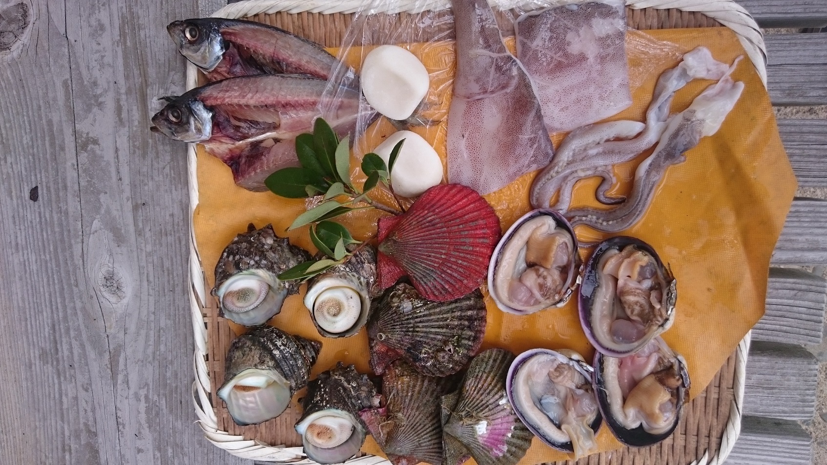 サザエ、大アサリ、バタ貝、干物、うに飯、お餅など相差で獲れた旬のもの。