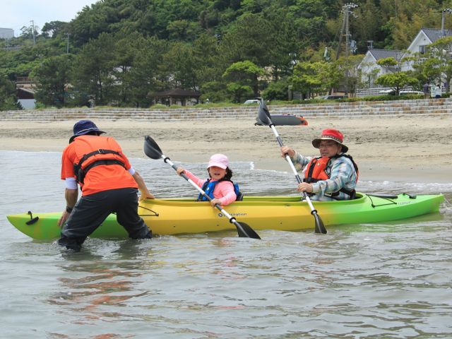 海水浴場内の浅瀬で、カヤックを漕ぐ練習をします
