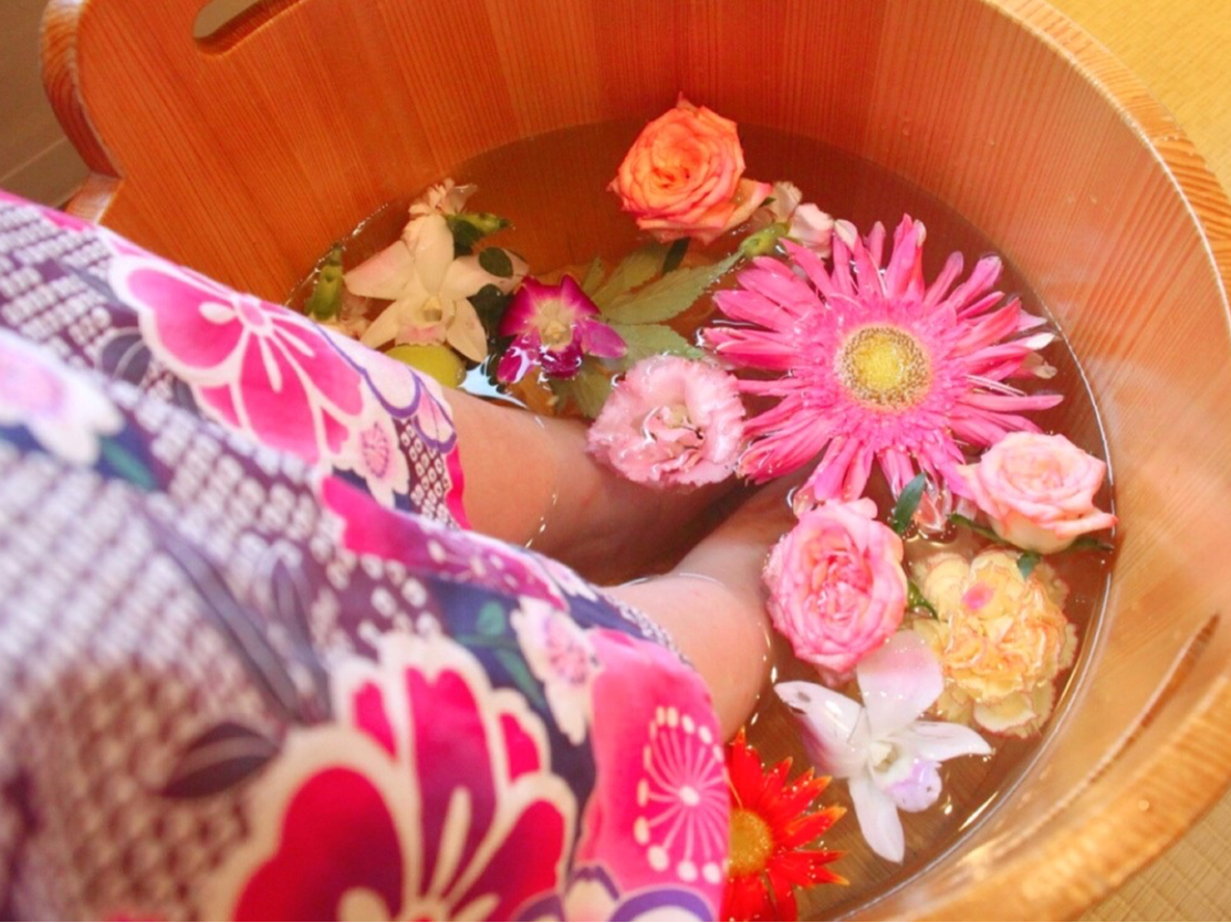 季節の花を浮かべた足湯や、抹茶の足湯などお好みの足湯をお選びいただけます。