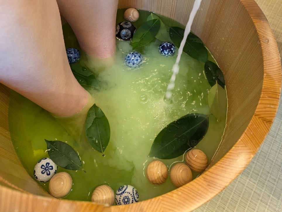 京都らしい和を感じられる足湯♪深呼吸したくなるような抹茶の香りで心も体もほぐれていきます。足湯に浸かって頂きながら、セラピストによるフットマッサージ35分をご堪能頂けるコースです