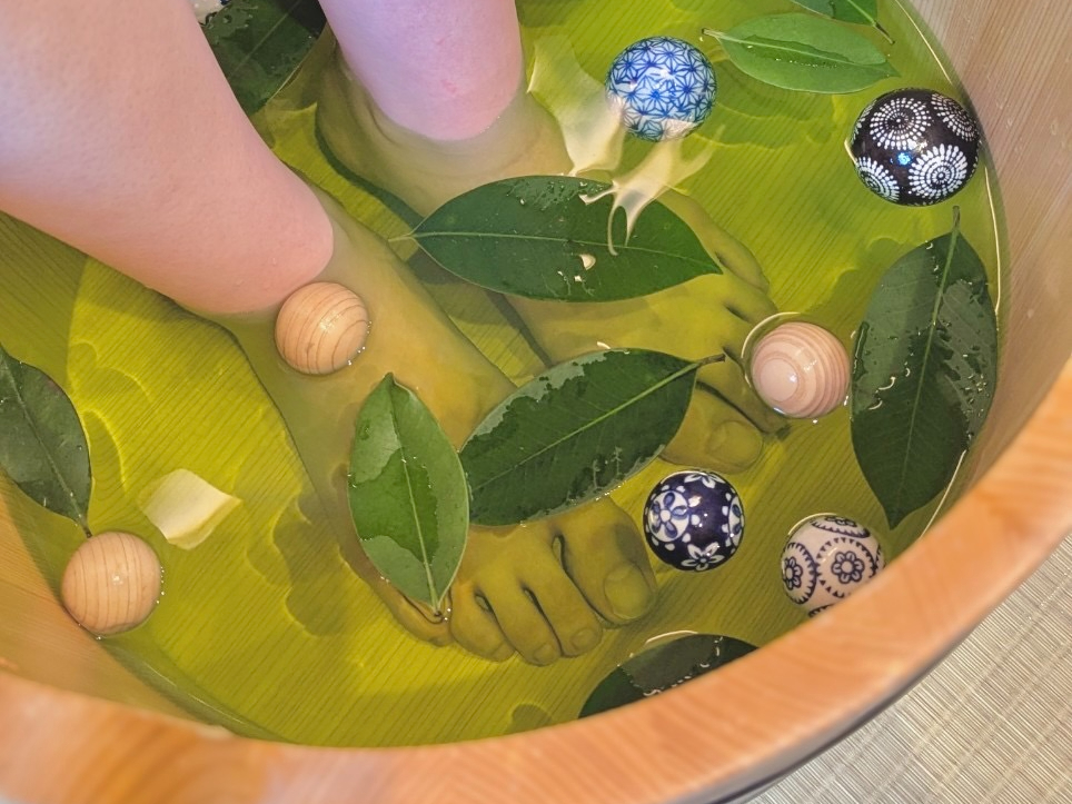 京都らしい和を感じられる足湯♪深呼吸したくなるような抹茶の香りで心も体もほぐれていきます。足湯に浸かって頂きながら、セラピストによるフットマッサージ35分をご堪能頂けるコースです