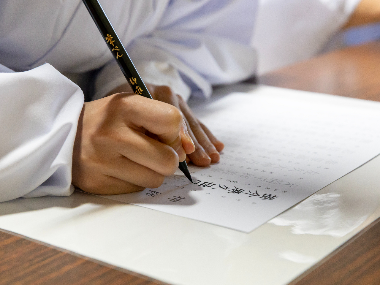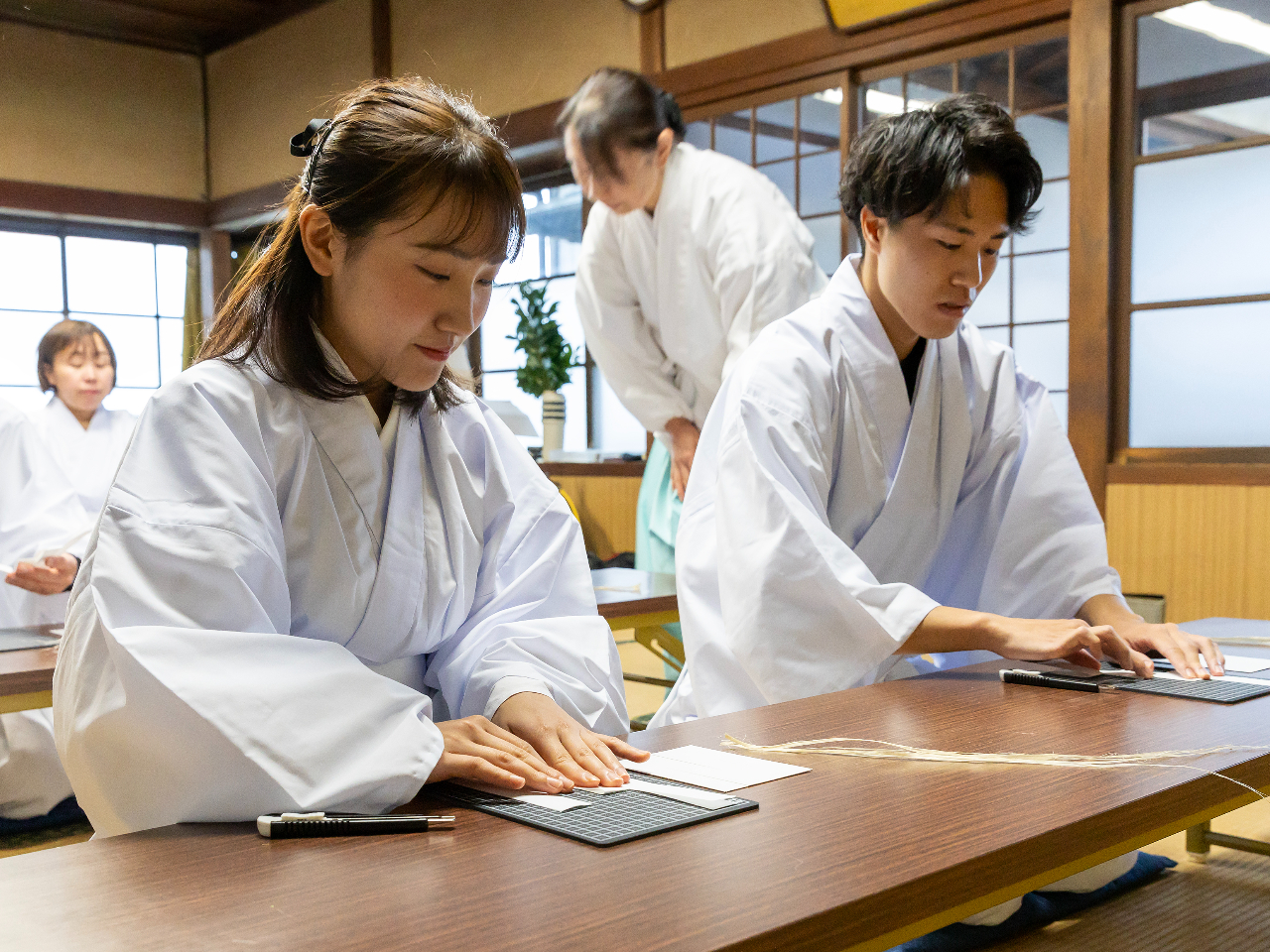 A神職衣装の着付け、祝詞書写体験、玉串榊を体験できます。