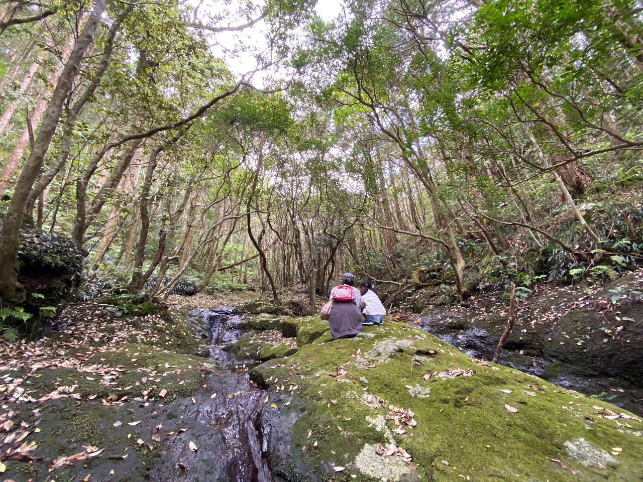 静かな水の流れとコケに囲まれて歩きます。