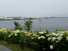海沿いに広い公園ですが、ゆりかもめの青海駅から降りてすぐのあたりには白い紫陽花がきれいに咲いていました。海と船を眺めながら紫陽花も楽しめました。