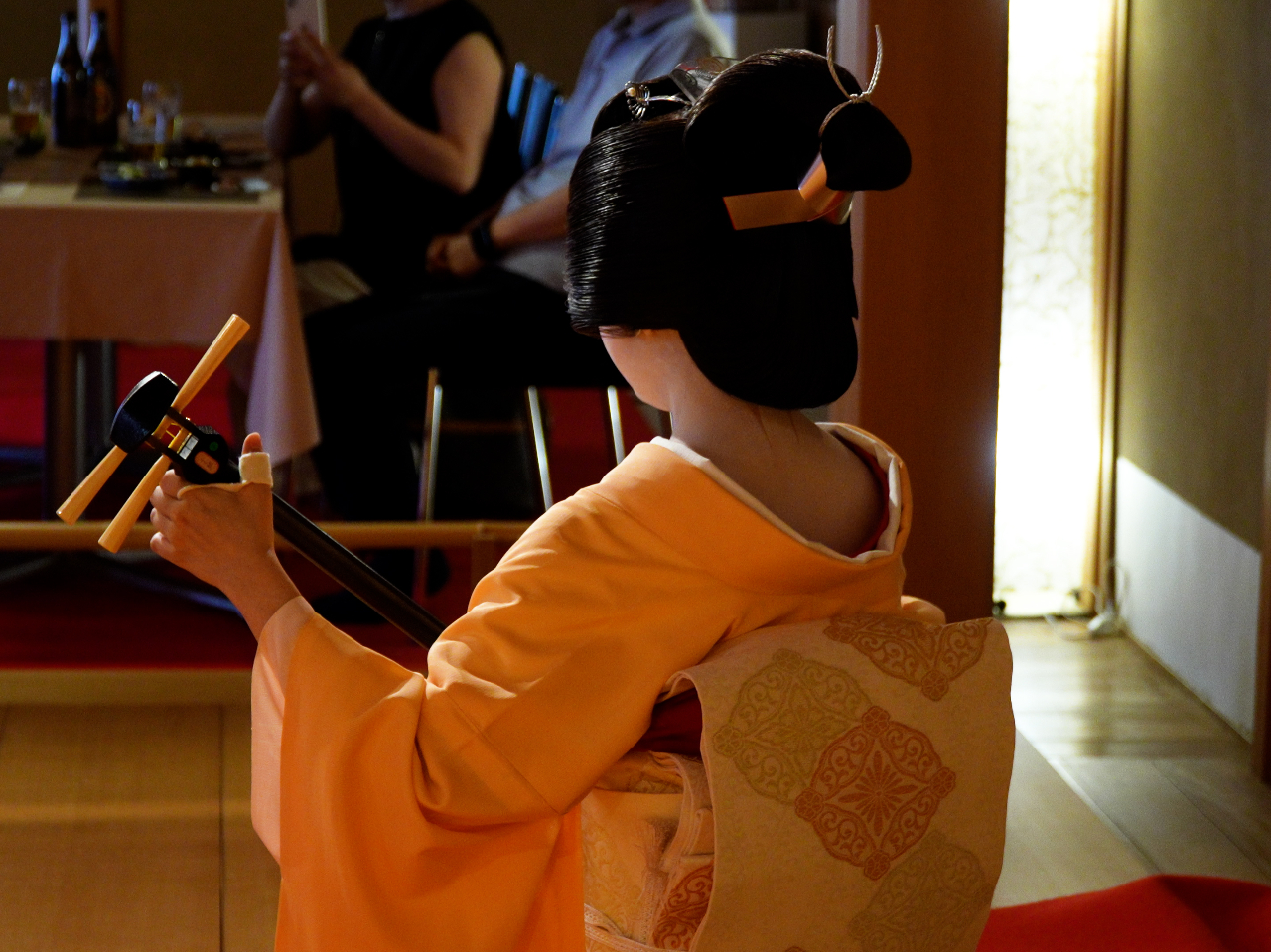 【毎週金曜日】能舞台で舞妓さんの舞−地方(じかた)による三味線生演奏(2ショット撮影・お座敷遊び・夕食・フリードリン付き)