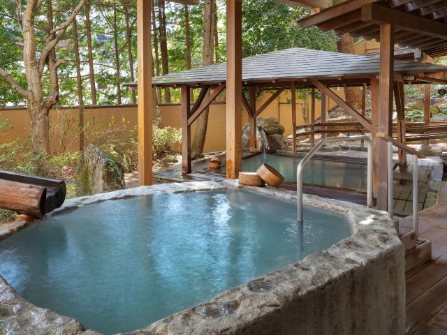 総檜露天風呂、岩露天風呂(女湯)、壺露天風呂(男湯)、大浴場と3つの温泉をお楽しみください。(岩露天と壺露天は男女が変わる場合がございます)