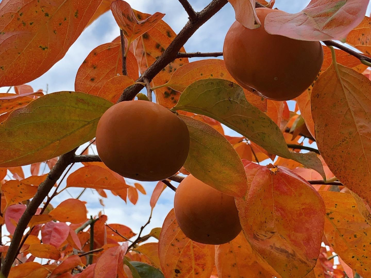 柿の葉の紅葉もとても綺麗です。柿狩りだけでなく、四季も味わってみてください。