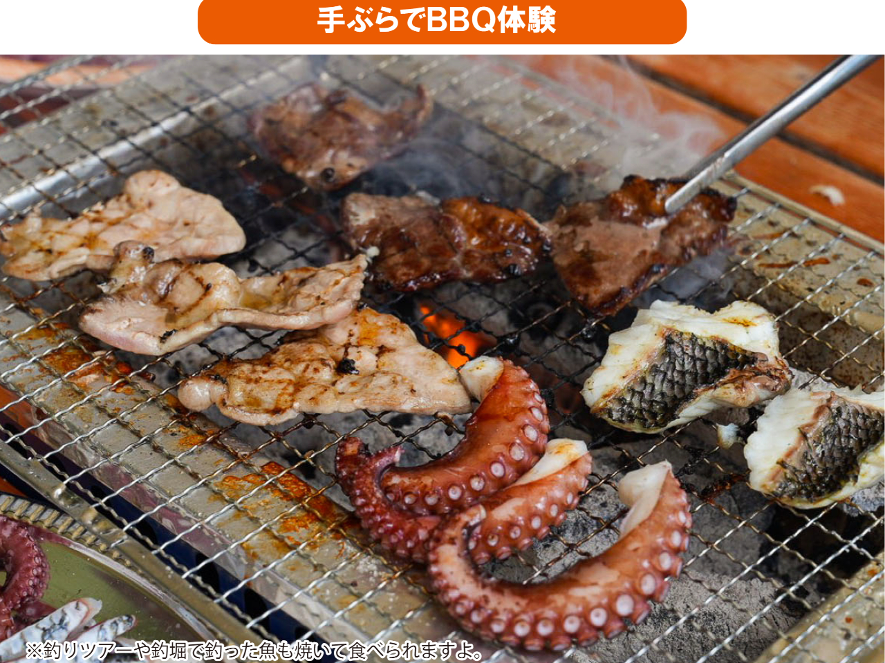 さらに、釣り上げた魚も炭火焼きで食べることができます。火おこしや後片付けも必要無し!手ぶらで気軽に楽しめるBBQです。
