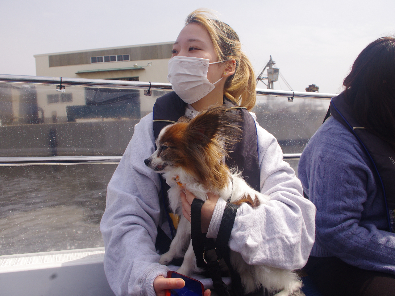 ・船内ではワンちゃんのリードを着用して頂き、膝の上で座った状態でクルーズをお楽しみ ください。