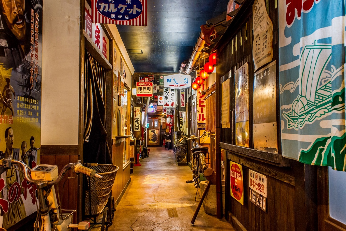 昭和の夜の横丁。 銭湯に居酒屋、スナック、ダンスホール・・・いろいろ並んでおります