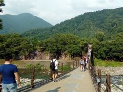 村営せせらぎ駐車場と世界遺産白川郷を結ぶ吊り橋です。観光客は期待に胸を膨らませてこの橋を渡り、世界遺産との出会いに満足し再度この橋を通ります。白川郷の想い出の最初と最後を彩る美しい橋です。