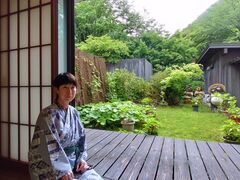 縁側の外には専用の庭が広がり、沢山置かれた陶器の狸が可愛いかった