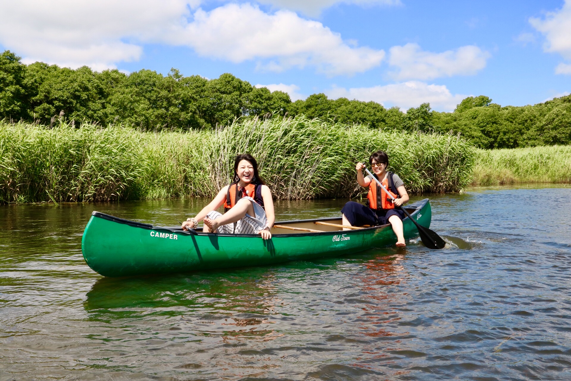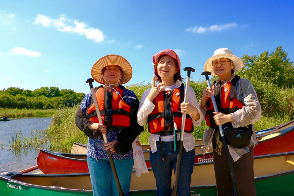 ガイドはお客様とは別のカヌーに乗り、お客様のみでカヌーの操船をしていただき、水鳥の多い湿地帯の中をのんびり下ります。