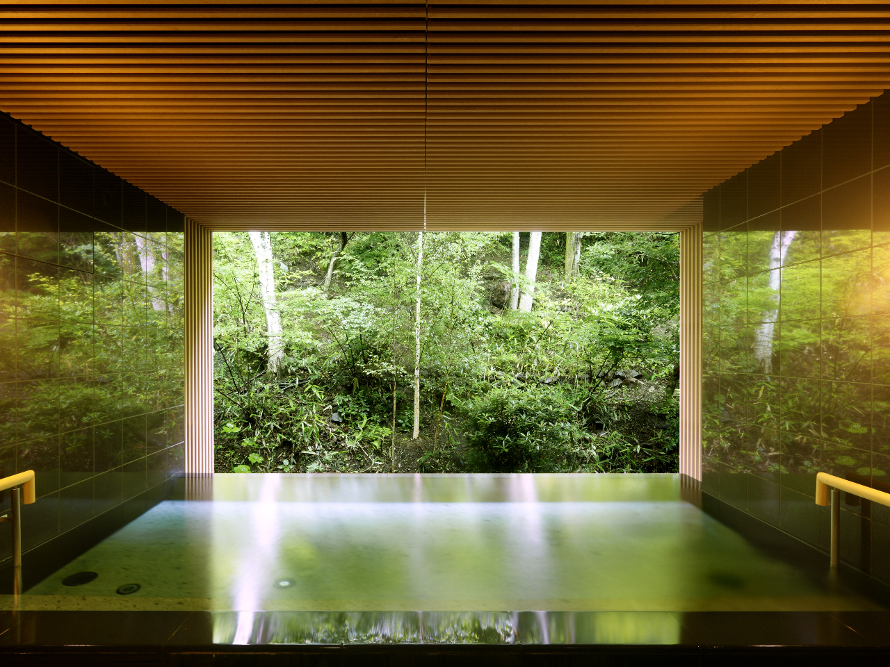 「湧泉」では、森の香りを全身で感じることができる、開放感あふれる大浴場。