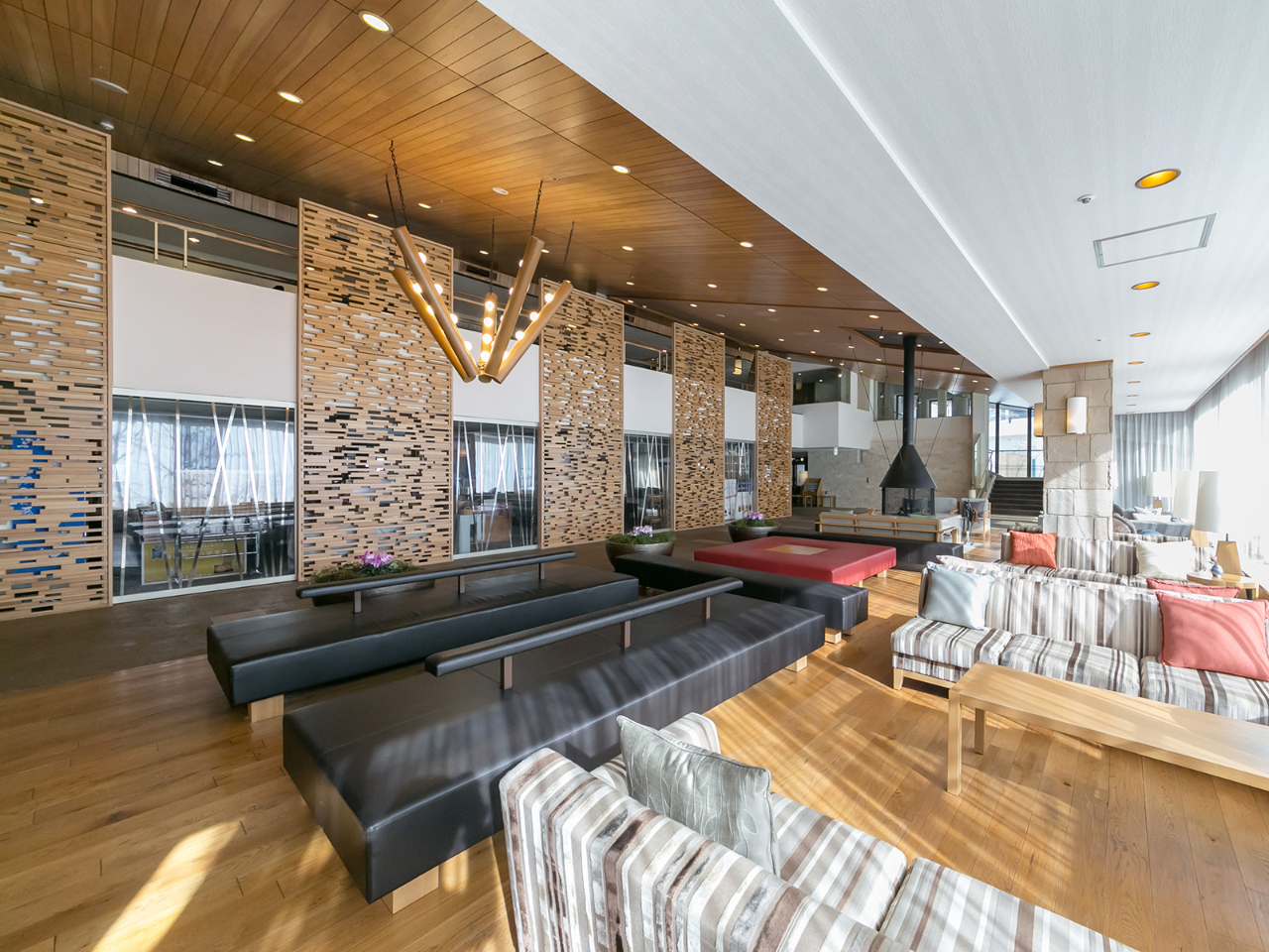 信州の森をイメージした空間に、思わず座ってみたくなるような個性的なくつろぎコーナーが並ぶ「森の音」。