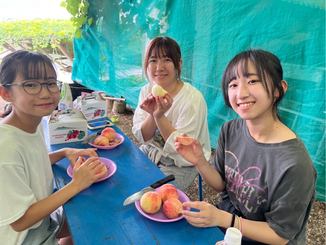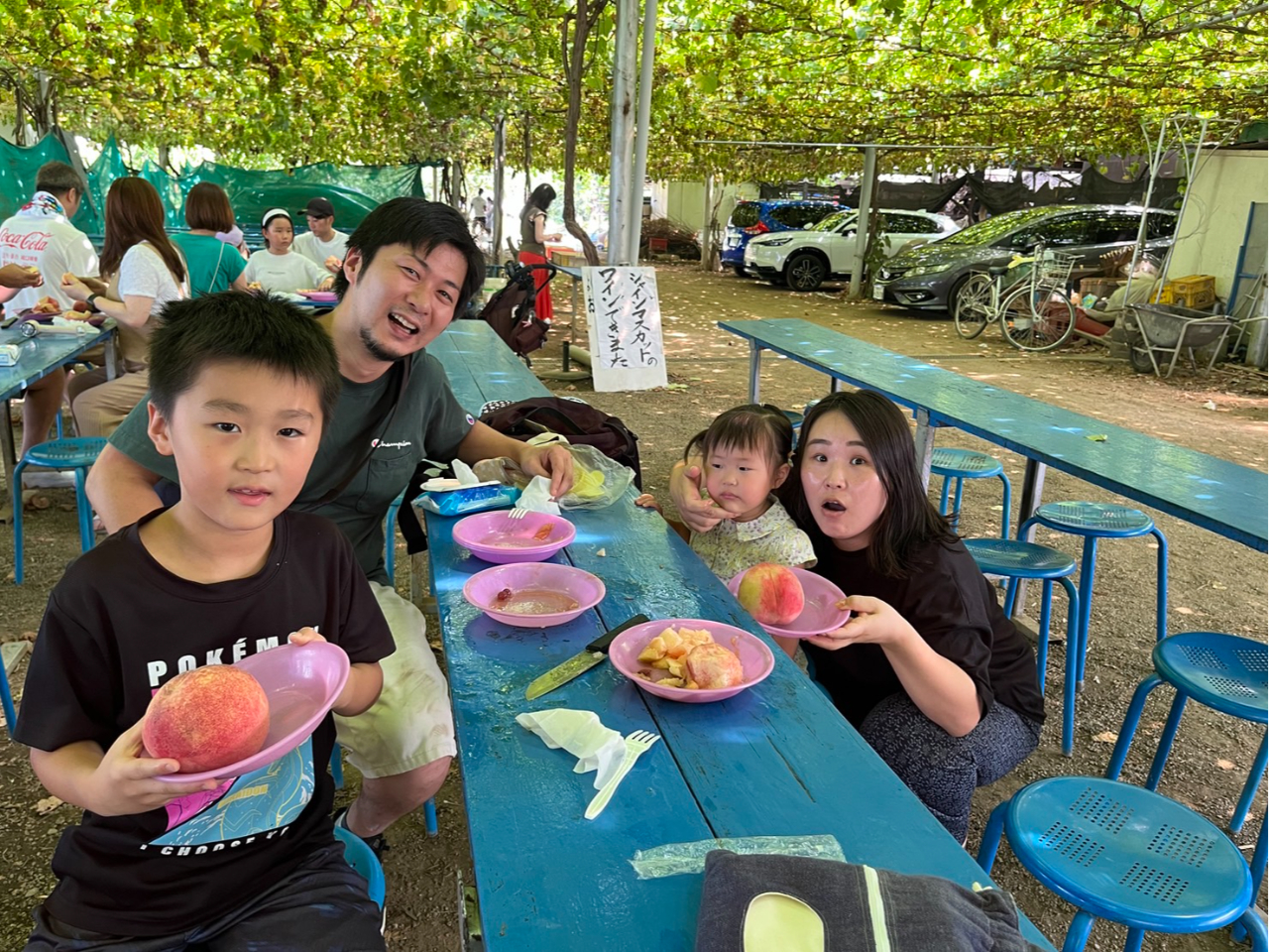 屋根がありイス・テーブルの用意がございますので、全世代ゆっくり桃の食べ放題をお楽しみいただけます。