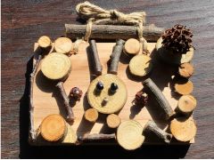 飾り板に木の実や小枝などパーツを組み合わせて立体的なオブジェや壁飾りを作ります。
