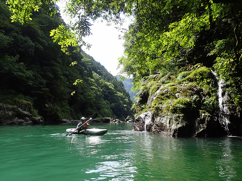C リーダーガイドは日本セーフティカヌーイング協会のインストラクター。奥多摩の川を