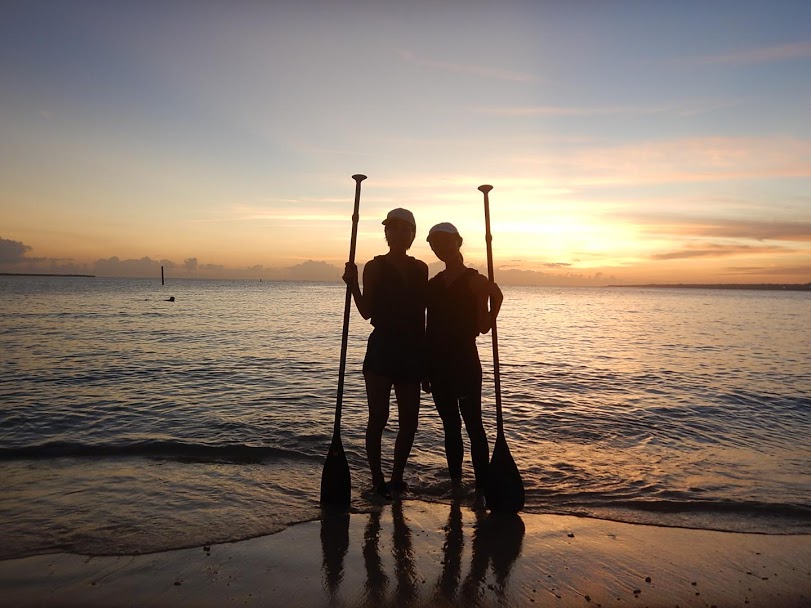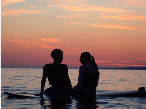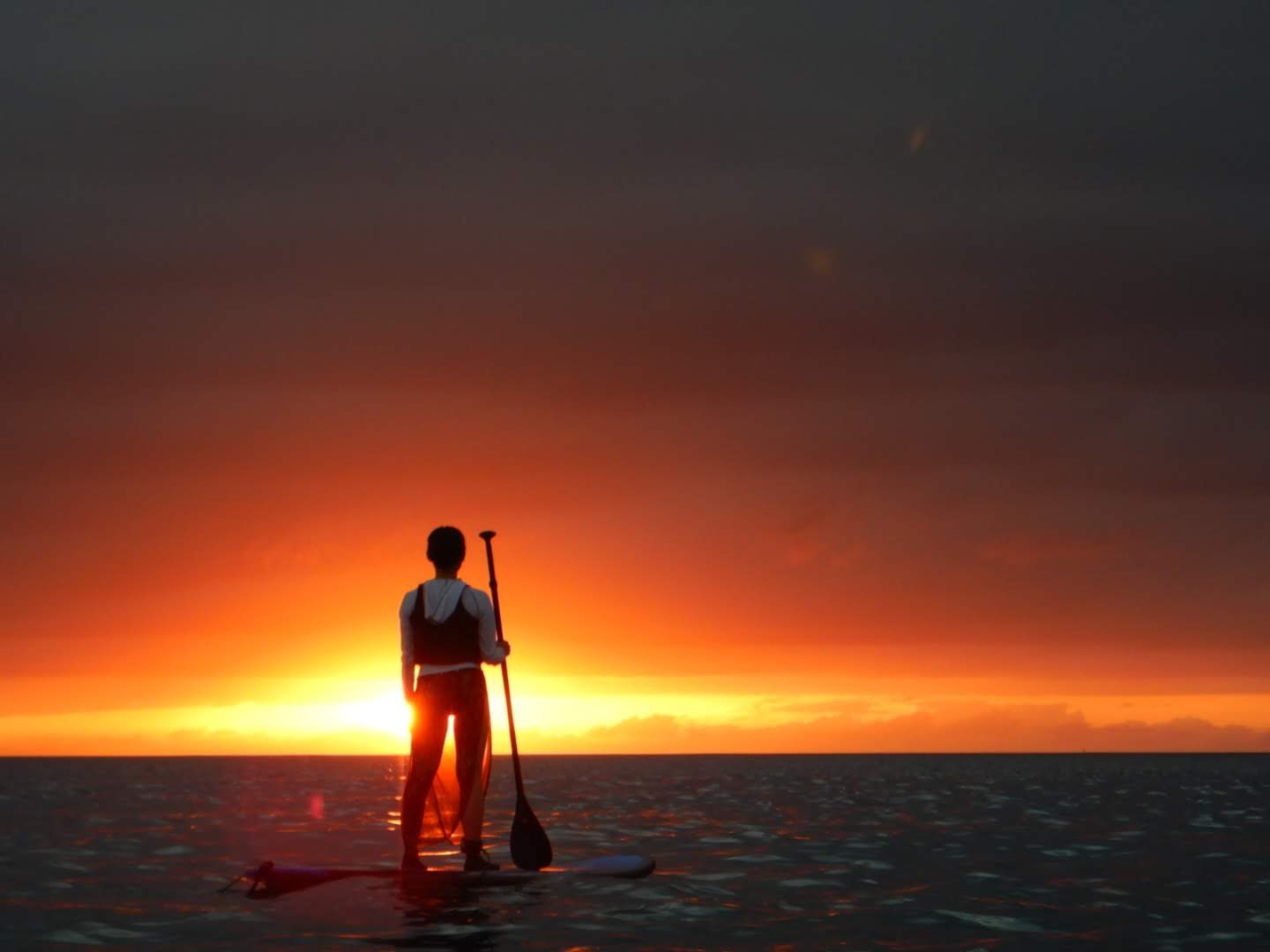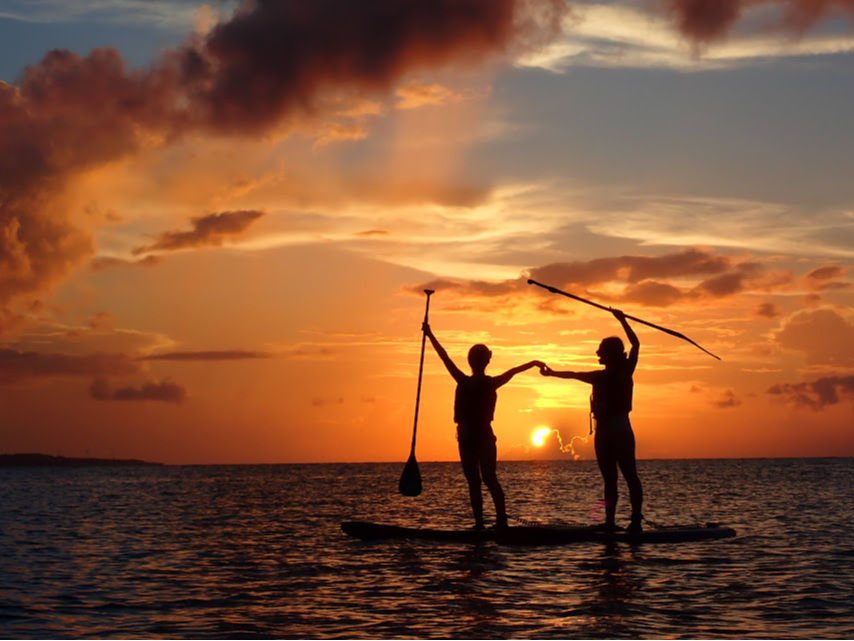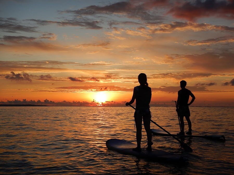 沖縄の海で夕日に包まれるサンセットSUPツアー